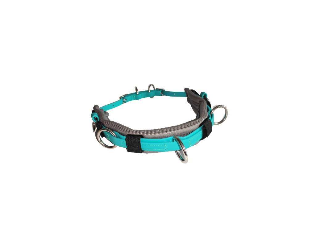 Materiál Biothane, barva petrolejová TE521, kování nerez, podložený šedým sympatexem